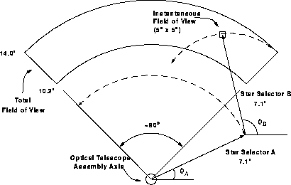 The instrument's total field of view (FOV), referred to as a pickle because it vaguely resembles the shape of a pickle, is a quarter annulus in the HST's focal plane, extending radially 10' to 14' from the telescope's boresight and axially 83.3° on the inner arc and 85° on its outer arc, an area of approximately 69 square arcminutes. The instantaneous field of view (IFOV) determined by the star selector assemblies and field stops is far smaller-5" by 5"-and its location within the pickle depends upon the Star Selector A and B rotation angles. Only those photons entering this IFOV aperture will be registered by the PMTs. To observe stars elsewhere, the star selector assemblies must be rotated to bring the IFOV to the target. This procedure is called slewing the IFOV.