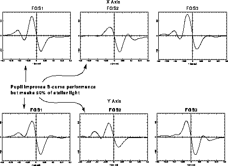 One way to minimize the effects of misalignment and the spherical aberration is to stop down the outer radius of the primary mirror of HST. All the FGSs have a 2/3 pupil stop on their filter wheels. This pupil stop retores the S-curves to a level which allows guiding across the entire pickle. Unfortunately, it also blocks 50% of the target's photons, so nearly a magnitude of sensitivity is lost. Figure 9.8 shows the improvement of the S-curve signature with the 2/3 pupil in place relative to the full aperture for the 3 FGSs at pickle center. Note also the performance of FGS 3 relative to FGS 1 and FGS 2 with full aperture.