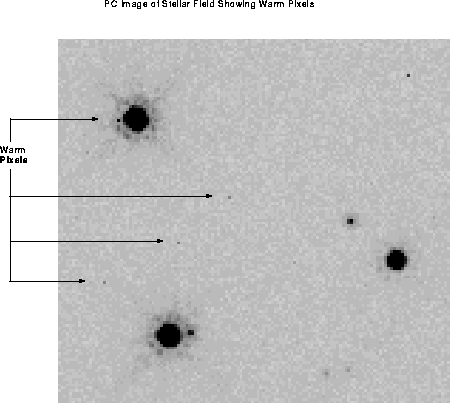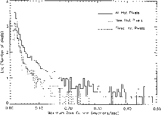 These bright pixels are warm pixels, or pixels with an elevated dark current. The vast majority of WFPC2 pixels have a total dark current of about 0.005 e-/s-1 (including the dark glow, discussed in "Dark Glow" on page 27-4). However, at any given time there are a few thousand pixels in each CCD, called warm pixels, with a dark current more than 0.02 e-/s-1, up to several e-/s-1 in a few cases (see Figure 26.5). Some of these pixels are permanently warm, but most become warm during the course of the month, probably as a consequence of the on-orbit bombardment by heavy nuclei. STIS, the other instrument currently aboard HST that uses CCDs, exhibits a similar behavior. Most warm pixels return to normal after the CCDs are brought to room temperature for a few hours.