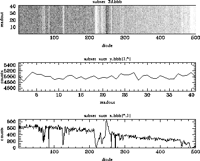 cl> blkavg subset_2d.hhh subset_sum_y.hhh b1=1 b2=41 option=sumFigure 35.21 shows plots of three images. At the top is a greyscale plot of the extracted two-dimensional image, in the middle is a plot of the sum of the 500 diodes as a function of time, and at the bottom is a summed plot of the spectra over time.