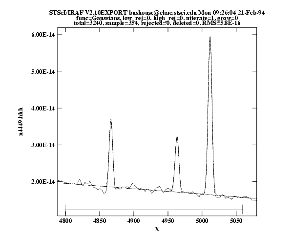 n4449.hhhand stores the results of the line fits in the STSDAS tablelinefits.tab. After you start the task, your spectrum should appear in a plot window and the task will be left in cursor input mode. You can use the standard IRAF cursor mode commands to rewindow the plot, resticting your display to the region around a particular feature or features that you want to fit. You may then want to: