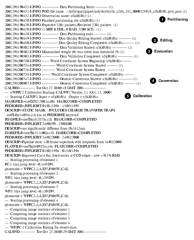 HST Archive Search WWW formor the Archive'sdatabase browser, StarView. The resulting raw and calibrated data files from this first pipeline processing are not seen by the observer. Instead, when an archive data request is submitted, the images are completely reprocessed by the On-The-Fly Reprocessing (OTFR) system before they are delivered. The OTFR system processing is identical to the OPUS pipeline processing, except that, as discussed in the previous section, the most up-to-date reference files and software at the time of processing are used. So, for example, if an observer waits several weeks after an observation before requesting the data products, it is very likely that OTFR will have access to an updated dark reference file with which to process the science data - a reference file that was not in place at the time the observation was taken (seeReference File Memo).All of the steps performed by OTFR are the same as those performed in the OPUS pipeline; these steps are recorded in the trailer file for each dataset. Figure 3.1 shows an example of a trailer file and identifies the major pipeline steps: