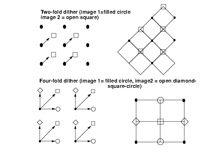 The PRF of an ideal square pixel, that is a boxcar function, severely suppresses power on scales comparable to the size of the pixel. According to the Shannon-Nyquist theorem of information theory the sampling interval required to capture nearly all of the information passed by square pixels is 1/2 the size l of a pixel. This corresponds to dithering the CCD from its starting position of (0,0) to three other positions, (0,1/2 l), (1/2 l, 0) and (1/2 l, 1/2 l); however, in practice, much of the information can be regained by a single dither to (1/2 l, 1/2 l).