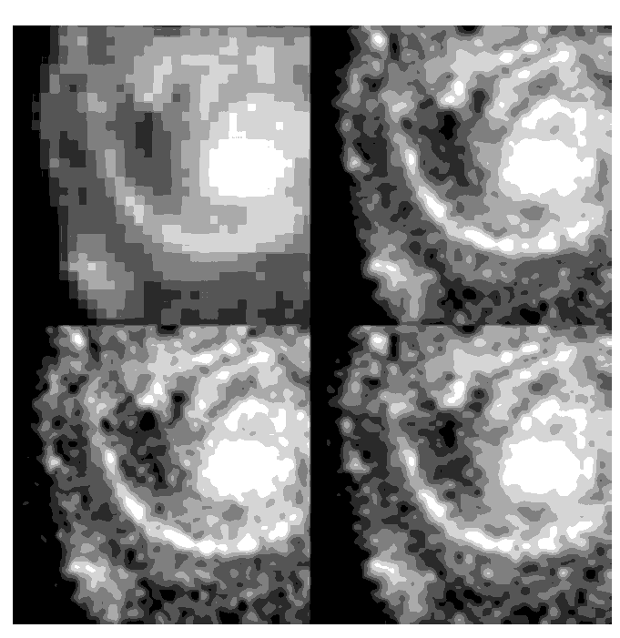 HST Dither Handbook.Although reconstruction largely removes the effects of sampling on the image, it does not restore the information lost to the smearing of the PSF and PRF. Deconvolution of the images, however, does hold out the possibility of recapturing much of this information. Figure 5.3, supplied by Richard Hook of the ST-ECF, shows the result of applying the Richardson-Lucy deconvolution scheme to HST data, used extensively in the analysis of WF/PC-1 data. The upper-left image shows one of four input images. The upper-right image shows a deconvolution of all of the data, and the lower two images show deconvolutions of independent subsets of the data. A dramatic gain in resolution is evident.