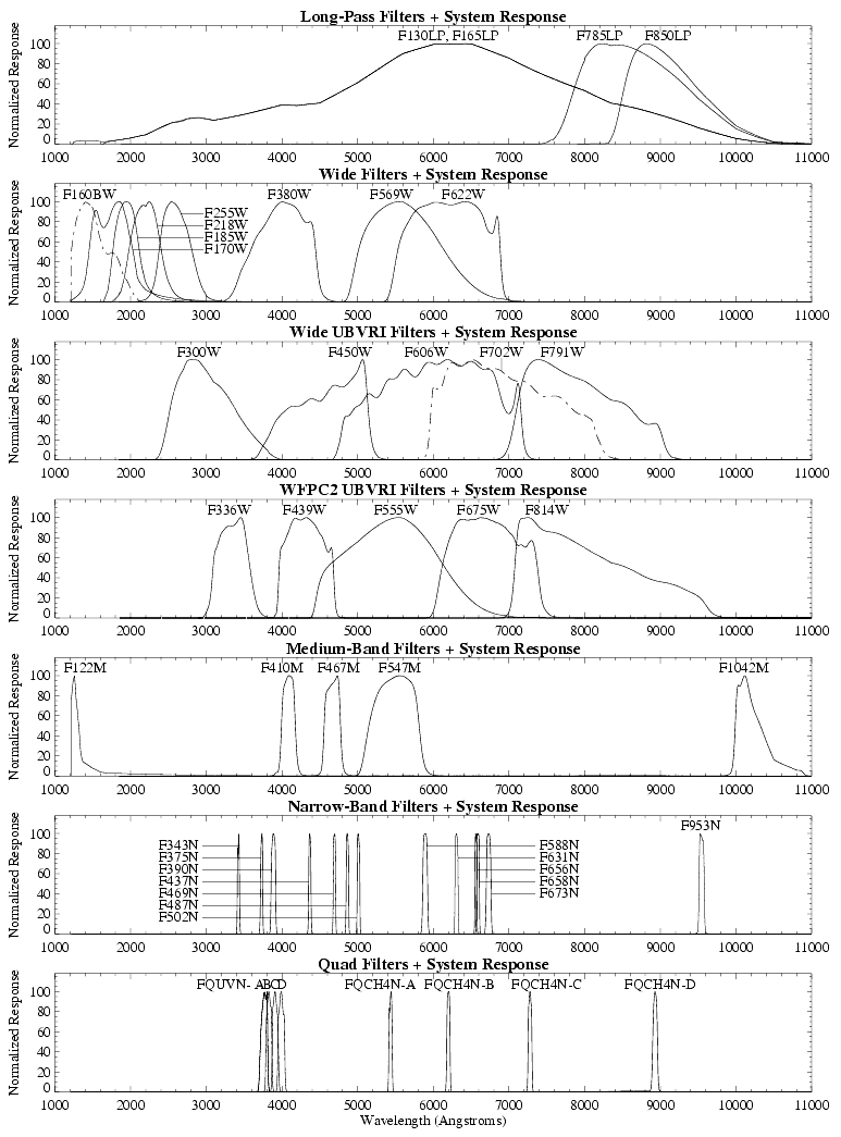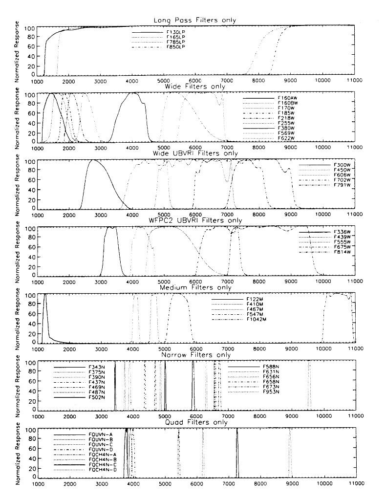 Figure 3.1 summarizes the normalized transmission curves for the simple filters and narrow-band quad filters. It does not include curves for the polarizing quad, or the linear ramp filters which are documented in Section 3.5 and Section 3.3, respectively. Figure 3.1 divides the filters into the following groups: