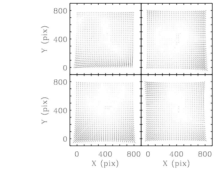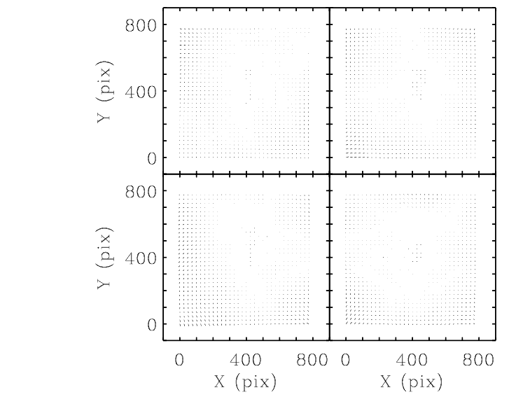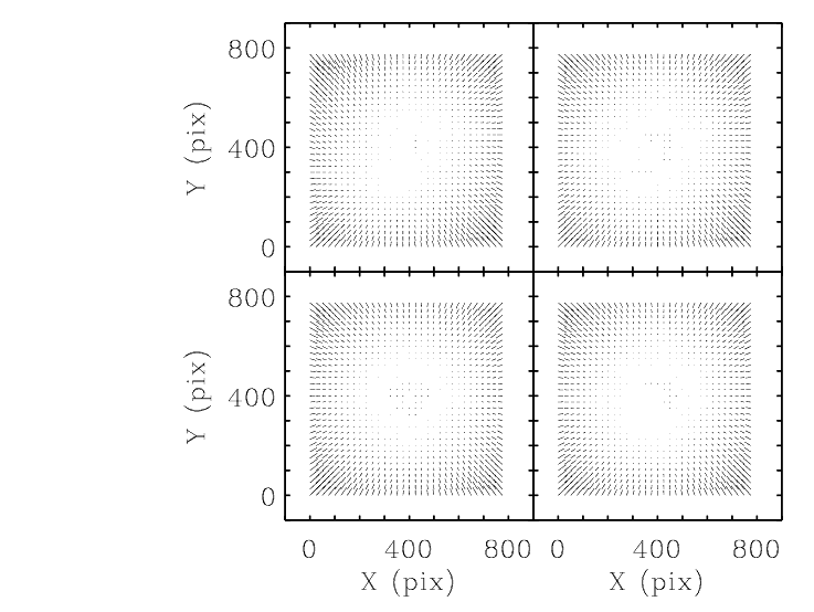 Figure 5.16: The geometric distortion map for F555W filter using the Anderson and King solution (2003). The size of the longest arrows are 6.29 pixel for the PC (in PC pixels) and ~6 pixel for WF cameras (in WF pixels). The panels correspond to PC - upper right; WF2 - upper left; WF3 - lower left and WF4 - lower right. The size of the residuals are scaled by a factor of 10 relative to the pixel coordinates.