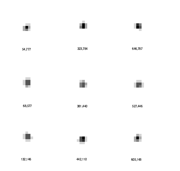 Figure 5.5: PSF Variations with Field Position - Aberrations. Nine observed PSFs (filter F814W) are shown from a widely spaced grid on WF3. CCD pixel positions are labeled. Note the flattening of the PSF in the (54,777) and (605,148) positions.
