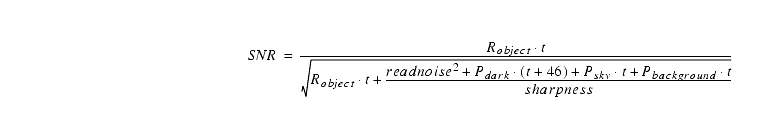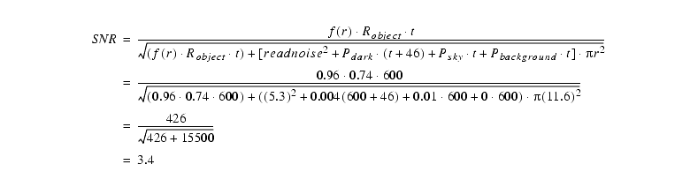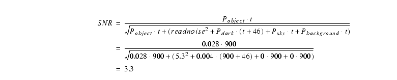 Next we estimate the SNR for each 900s sub-exposure using Equation 6.14 and Table 6.9. For this narrow filter the sky background can be ignored. We presume there is no background light from astrophysical sources: