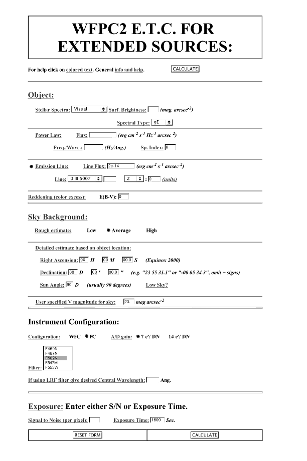 Figure 6.7: Extended Source Form for WFPC2 On-Line Exposure Time Calculator. Here the target is a galactic [OIII] 5007 line emission source and is observed on PC with filter F502N. SNR is computed for 1800s exposure.
