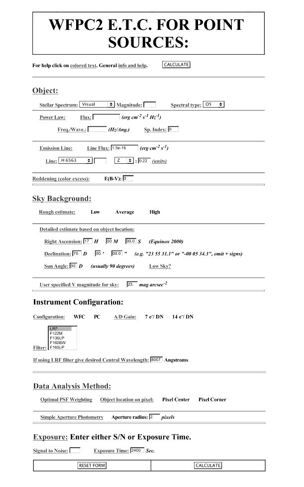 Figure 6.2: Sample Fill-out Form for WFPC2 On-Line Exposure Time Calculator..