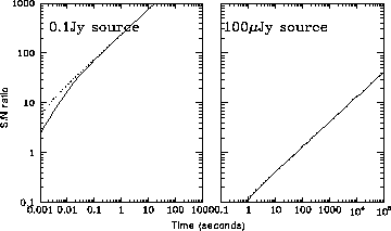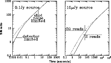 In these modes (ACCUM, or MULTIACCUM), the observation of the source in question is always photon-noise limited, and so the read noise of the detector is irrelevant, and the signal to noise increases roughly as the square root of the integration time. In the right panel is shown the case of a 10µ Jansky source (observed through the same filter). In this case, the number of readouts does have an effect on the signal to noise obtained for integration times less than about 1000 seconds. Where the signal to noise obtained is about 5 (integration times of a little less than a minute), increasing the number of readouts by a factor of ten can improve the signal to noise obtained by up to a factor of three or thereabouts. This example illustrates an important point: so long as the background is relatively faint, then if the signal to noise obtained is low, it is probably possible to improve it without increasing the integration time, by increasing the number of readouts. A balance should be sought between the integration time saved by doing this and any extra overhead incurred by making multiple readouts. Example 2: Signal to noise with high background