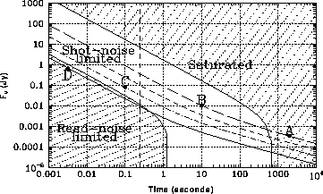The dark current we take to be 0.1e-/sec, from Table 7.1. The read noise from Table 7.1 is 28e- for this detector. The required signal to noise is 25.2. We can now use equation (5), and we find that the time required is 507 seconds. It must be borne in mind that this is only the on source time, and that another 507 seconds observation of the background will be required.