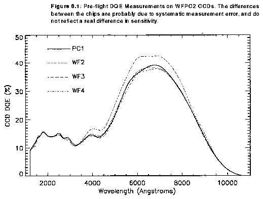 The front surfaces of the CCDs are overcoated with a Lumogen phosphor, which serves as the primary detection medium for photons shortward of about 4800Å, down-converting these to 5100Å - 5800Å. Its long wavelength cutoff (4800Å) is also well matched to a CCD's intrinsic sensitivity. The QE of the four flight WFPC2 CCDs is shown in Figure 4.2, which demonstrates the uniform UV response of 10-15% and a peak optical QE of 40%.