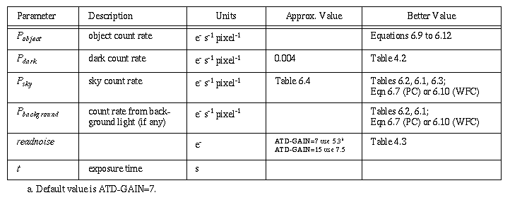 A generalized equation for estimating point source signal-to-noise ratio per exposure is given below (Equation 6.6). It is exact in both the bright and faint object limits, and is a reasonable approximation to the intermediate case. Pbackground represents any generalized source of diffuse background light (e.g. galaxy on which target is superposed). Table 6.6