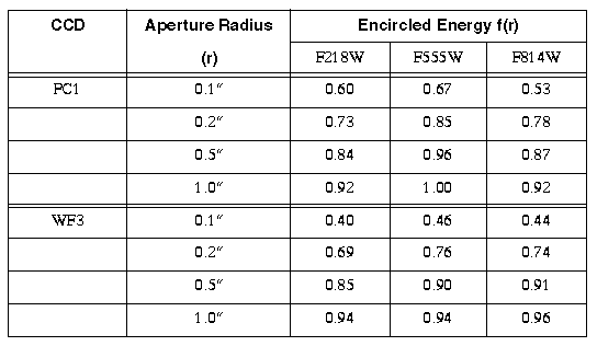 where S is the number of detected photons, f(r) is the fraction of the total counts encircled by the aperture with radius r, and Robject is target count rate. Representative values of f(r) are given in Table 6.76.5.2 Point Sources -- Aperture Photometry