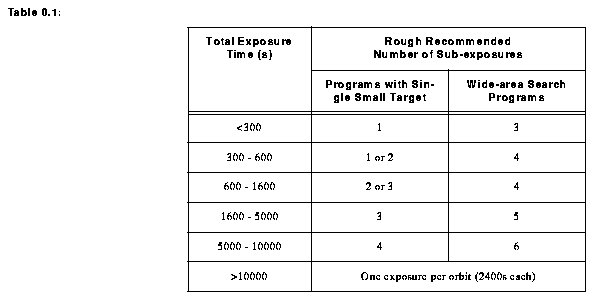 gives very rough recommendations for the number of sub-exposures for a given total exposure time. Note that splitting into many sub-exposures introduces additional overhead time and will increase the noise for "read noise" limited exposures (usually exposures in UV or narrow band filters), and hence one should not use more sub-exposures than are truly required by the science goals.