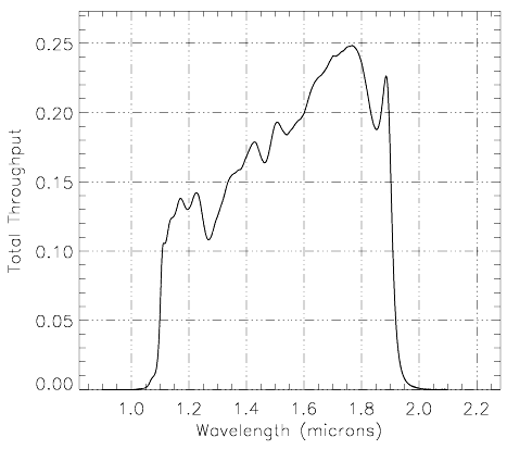 Camera 3, Filter F150W Notes: Grism B continuum. Thermal background important. Central wavelength: 1.5371 µm Mean wavelength: 1.5548 µm Peak wavelength: 1.7675 µm Wavelength range: 1.1-1.9 µm FWHM: 0.7512 µm Maximum throughput: 24.845% Central pixel fraction: 0.475 Figure A1.75: NIC3, F150W Throughput Figure A1.76: NIC3, F150W Sensitivity Curves