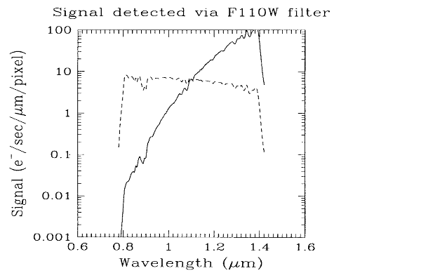 Figure 4.4: Detected Source Spectrum. These are for sources with color temperatures of 700K (solid line) and 10,000K (dashed line). It is easy to see that the detected image will be dominated by the flat field response in the 1.2-1.4 µm region for a 700K source, while for a 10,000K source the detected image will be affected by the flat field response throughout the filter bandpass.