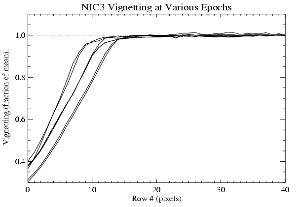The lateral shifts of the NICMOS dewar have resulted in vignetting in all three cameras. The primary source of the vignetting is a slight misalignment of the FDA mask. Relatively small losses in throughput are observed at the bottom ~ 15 rows of both NIC1 and NIC2 as shown in Figure 4.11.