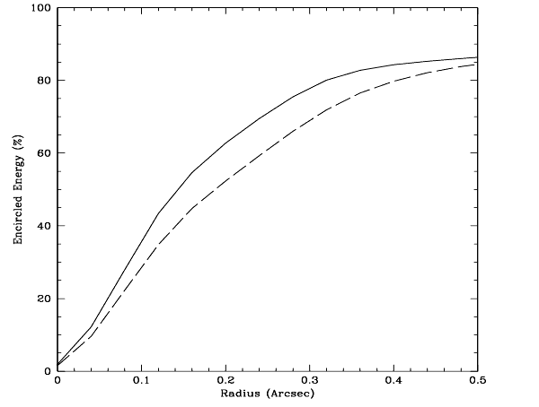 Figure 4.13: NIC3 encircled energy at 1.6 microns at optimum focus (PAM=-13 mm, solid line) and at the best achievable focus (PAM=-9.5 mm, dashed line) with the HST secondary mirror at nominal position.![]()