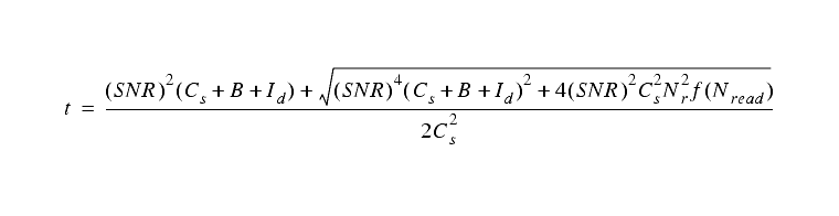 The other situation frequently encountered is when the required signal to noise is known, and it is necessary to calculate from this the exposure time needed. In this case one uses the same instrumental and telescope parameters as described above, and the required time is given by: