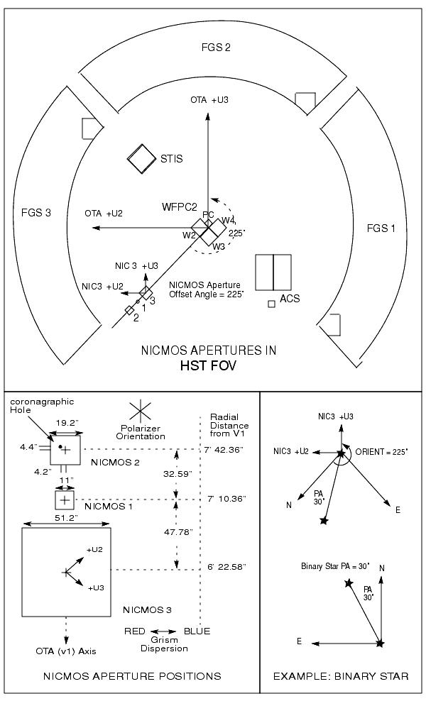 While the Phase II proposal instructions contain the definitive instructions and examples for specifying the desired orientation for HST, we provide a simple example in Figure 6.2. A binary star with a position angle (PA) 30º measured east from north is to be positioned with the southern star in Camera 3 and the northern star in Camera 2. That is, we want the line connecting the two stars to lie along the NICMOS + y axis. The resulting HST orientation is 225º + 30º = 255º. (