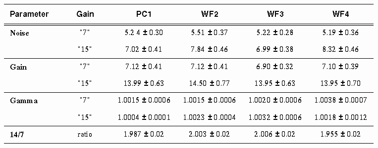, as are read noise and linearity ("gamma" is the power law index relating detected DN to input flux). Note that all calculations of sensitivity in this manual assume gains of 7 and 14 for two gain channels, choices very close to the measured gains. The photometric calibration is based on an assumed exact gain of 14 in all CCDs. The measurements given here were derived from thermal vacuum testing. On-orbit measurements have confirmed that the gain ratios are correct to within a possible systematic error of 1%--which will feed directly into a photometric calibration error for gain 7 data, as most of the photometric calibration was done with gain 14 data. Note that the gain ratios are known much more accurately than the individual gains; they are derived from flat field ratios instead. Also, note that the Phase II proposal instructions refer the ~14 e- DN-1 setting as ATD-GAIN=15.