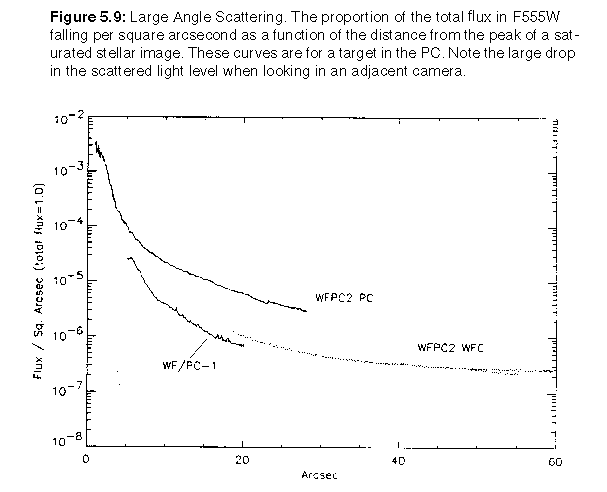 The source of the WFPC2 scattering may be the CCDs. The WF/PCl CCDs were back illuminated and had shiny surfaces. The electrode structure was not visible over most of the wavelength range. The WFPC2 CCDs, however, are front illuminated, so the electrode structure is visible and may be scattering the light. There was a large ghost in WF/PCl due to a reflection between the CCD and filter, but no such feature has been seen in WFPC2. The flux from this missing ghost may instead constitute part of the scatter. (See also related material in "Observing Faint Targets Near Bright Objects" on page 146.)
