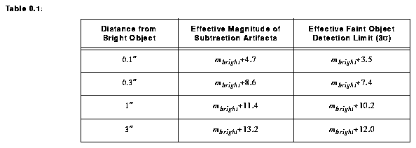 Large angle scattering may also impact identification of very faint objects near very bright ones. This scattering appears to occur primarily in the camera relay optics, or in the CCD. Hence, if a faint target is more than ~10" from a bright object (i.e. very highly saturated object), it would be advisable to place the bright object on a different CCD, so as to minimize large angle scattering in the camera containing the faint target. See section on "Large Angle Scattering" on page 99. Note also that highly saturated PSFs exist for PC1 in filters F439W, F555W, F675W, and F814W, and for F606W on WF3; these may be useful when attempting to subtract the large-angle scattered light. As of this writing TinyTIM does not accurately model the large angle scattering, and should be used with caution when analyzing highly saturated images (Krist 1996).