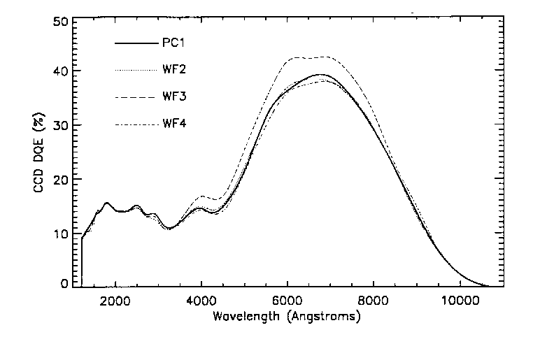 The front surfaces of the CCDs are overcoated with a Lumogen phosphor, which serves as the primary detection medium for photons shortward of about 4800Å, down-converting these to 5100Å - 5800Å. Its long wavelength cutoff (4800Å) is also well matched to a CCD's intrinsic sensitivity. The QE of the four flight WFPC2 CCDs is shown in Figure 4.2, which demonstrates the uniform UV response of 10-15% and a peak optical QE of 40%.