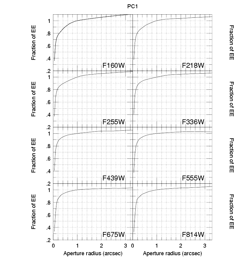 The WFPC2 curve shown is the average of measurements taken with F336W and F439W. It can be seen that the core of the image in WFPC2 contains most of the light. At this wavelength, 65% of the light is contained within a circle of radius 0.1". However, this proportion is considerably less than the optics deliver. The reason for this is discussed in CCD Pixel Response Function. Encircled energy curves for other filters are shown in Figure 5.3 and Figure 5.4; note that these curves are normalized to unity at 1.0" radius.