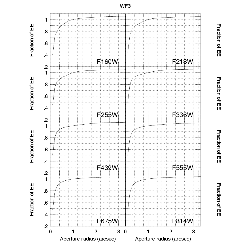 Figure 5.4: Encircled Energy for CCD WF3. The fraction of energy encircled is plotted vs. aperture radius for several filters. Curves are normalized to unity at a radius of 1.0". From Holtzman, et al., 1995a.![]()