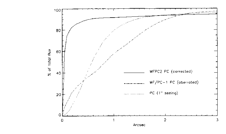 It shows the aberrated HST PSF, the WFPC2 PSF, and for comparison the PSF that would be obtained from a long integration if HST were installed at a ground based observatory with one arcsecond seeing. All of the PSFs were computed at 4000Å. The FWHM of the image both before and after the installation of WFPC2 is approximately proportional to wavelength, at least before detector resolution and MTF effects are considered. (The WF/PC-1 core was approximately 50% broader than the core that is obtained with WFPC2). Figure 5.2 shows the encircled energy (EE), the proportion of the total energy from a point source within a given radius of the image center, for the same three cases.