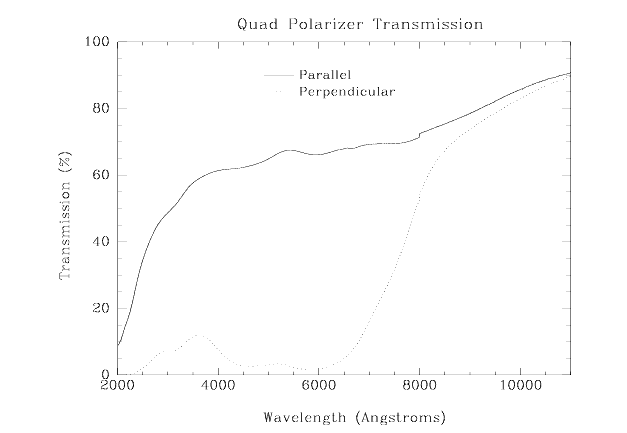 The required polarization angle is selected by filter name and aperture location as shown in Table 3.10. The transmission of the quad polarizer is shown in Figure 3.7. The polarizer is afocal and must therefore usually be used with another filter which will largely define the shape of the passband.