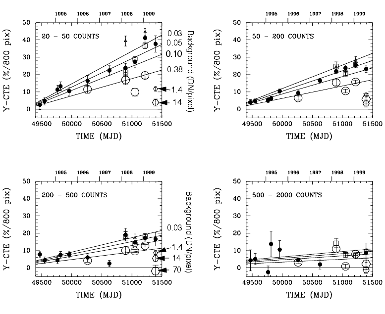 Figure 4.14: Y-CTE loss in stellar photometry as a function of epoch and background light. Each panel corresponds to a different range of target count levels (1 DN = 14 electrons). Different symbols correspond to different background levels; the larger plotting symbols indicate images with larger backgrounds. The straight lines represent the best-fit multilinear regression for Y-CTE as function of time, log counts (DN), and log background. See Whitmore et al. (1999).![]()