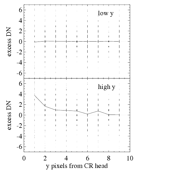 The total counts in these cosmic ray "tails" is a useful metric of CTE. As shown in the top panel of Figure 4.18, no significant tail is apparent at low Y. But at high Y an exponentially declining tail is readily apparent with an e-fold decay of 2 pixels (indicating that charge is released on the 10's of milliseconds timescale). This Y dependence closely mimics that seen in stellar photometry. These tails are very similar to those seen for hot pixels.