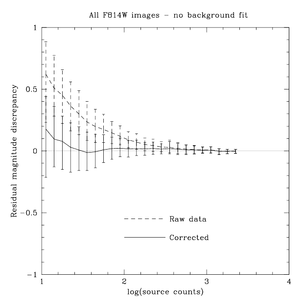 Figure 4.21 shows the uncorrected magnitude errors for individual F814W observations of a field in NGC 2419 containing stars of various magnitudes, observed with exposure times ranging from 10s to 1000s and various preflash levels. The anomaly is illustrated by the rise in magnitude errors for low source counts. The effect of our correction is shown in Figure 4.22, where the dashed line and error bars plot the median and quartiles of uncorrected magnitude errors, while the solid line indicates the median of the residual magnitude errors, after the correction in Equation (1) is applied. Magnitude errors are corrected quite well, except for very faint sources (< 30 counts).