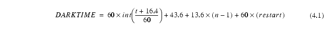 where t is the requested exposure time in seconds, and n is the number of the CCD (PC1=1, WF2=2, etc.), and int() indicates the next lower integer. A duration of 16.4s is required to clear the CCDs before the exposure begins, and 13.6s is needed to read each CCD after the exposure. External exposures of 180s or longer made with the serial clocks off (CLOCKS=NO; the default setting) suffer an additional 60s of darktime (restart=1). This delay is associated with restarting the serial clocks for readout in exposures where the spacecraft AP-17 processor provides shutter control with loss-of-lock checking. Exposures made with the serial clocks on (CLOCKS=YES) avoid this extra 60s (restart=0).