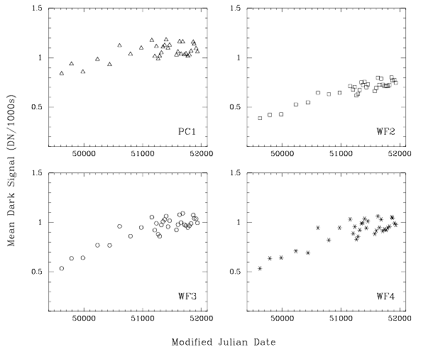 On-going measurements of the dark current in the WFPC2 detectors indicate that the average level of dark current has been slowly increasing over the instrument's lifetime. We have recently re-analyzed dark current data taken at various intervals from Sept. 1994 to Jan. 2001. Figure 4.7 shows the median dark current for the central 400 x 400 pixels of each CCD at gain 7, each taken just after WFPC2's monthly decontamination. Each data point represents the median of 5 raw 1800s dark frames (after rejection of cosmic rays and bias subtraction, normalized to units of DN/1000sec).