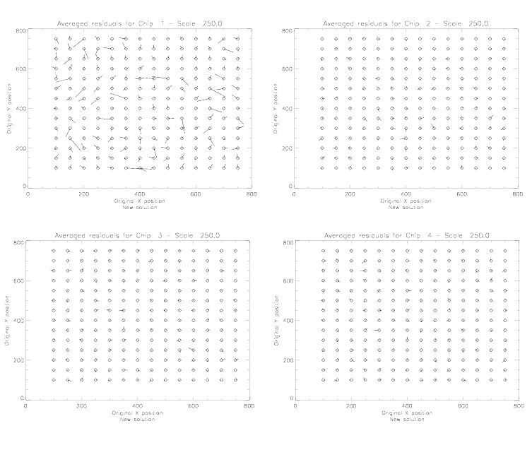 The residual maps presented in Figure 5.15 indicate the average residual at each position after using the above equations to remove the distortion. The residuals are expressed in PC pixels and scaled by a factor of 250. Each tickmark, which is 50 units, corresponds to about 9 mas. The residual length is mostly noise.