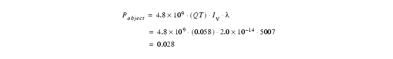 Next we estimate the SNR for each 900s sub-exposure using Equation 6.14 and Table 6.9. For this narrow filter the sky background can be ignored. We presume there is no background light from astrophysical sources: