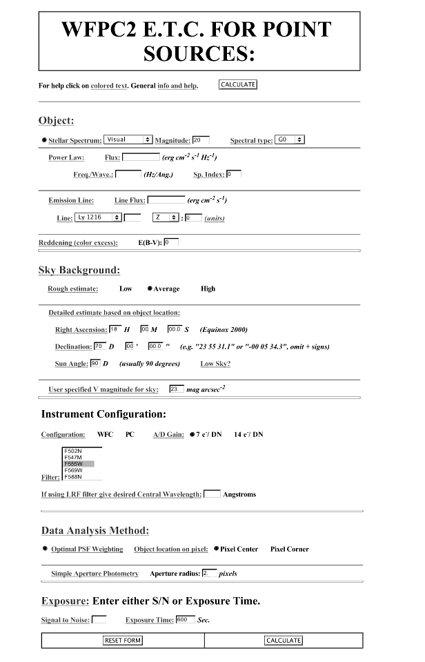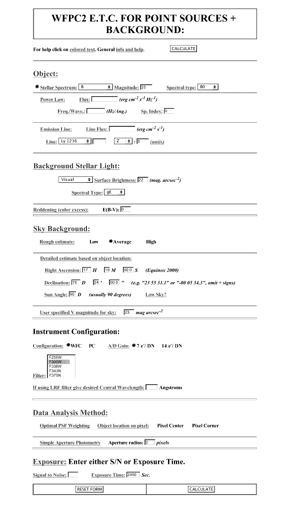 Figure 6.2: Sample Fill-out Form for WFPC2 On-Line Exposure Time Calculator..