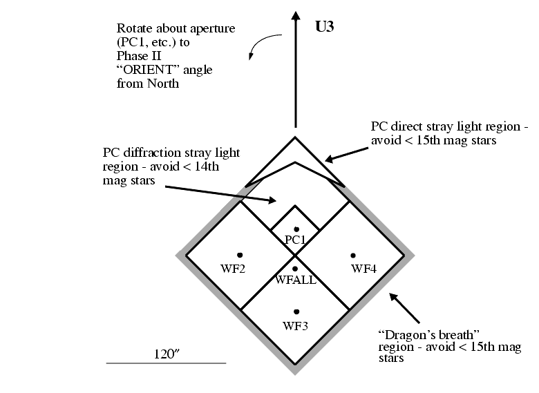 Figure 7.3: Bright Object Avoidance Regions Near WFPC2 FOV.help@stsci.edu) gives more detailed discussions of artifacts associated with bright objects, and their avoidance.