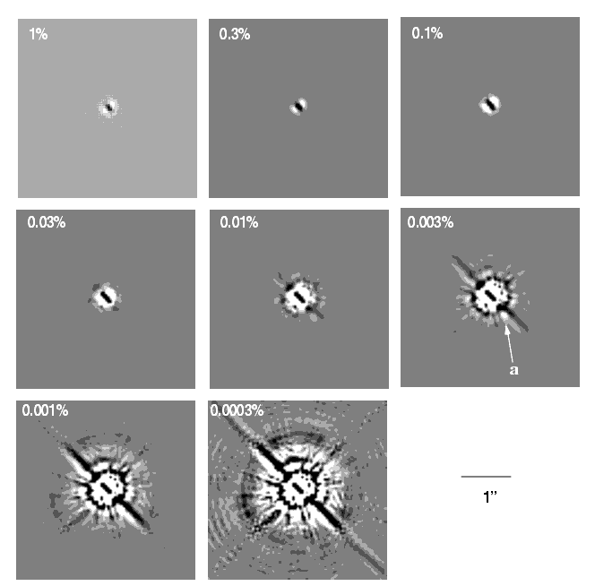 Figure 7.2 illustrates the effect of OTA breathing, and periodic focus adjustments, on PSF subtraction. It shows the difference between an "in focus" PSF and one where the OTA secondary mirror has been moved by 5µm. This amount of focus change is comparable to the range of OTA "breathing" effects (time scale <1 hour), and the periodic (semi-annual) focus adjustments of the OTA. Each panel shows a different contrast setting; the percentages indicate the energy per pixel which is plotted as white, expressed as a fraction of the total (un-subtracted) PSF energy. For example, features which are just white in the "0.003%" panel contain 0.003% of the total PSF energy in each pixel. In other words, the feature labeled "a" is, in effect, ~10 magnitudes fainter than the PSF of the bright object, so that it may be very difficult to detect a "real" companion object ~10 magnitudes fainter than the bright object, at this distance from the bright object. In a real PSF subtraction situation, other effects including PSF sampling, noise, and pointing instability would further degrade the subtraction. (The elongated appearance of the residuals in the PSF core is due to astigmatism in PC1.