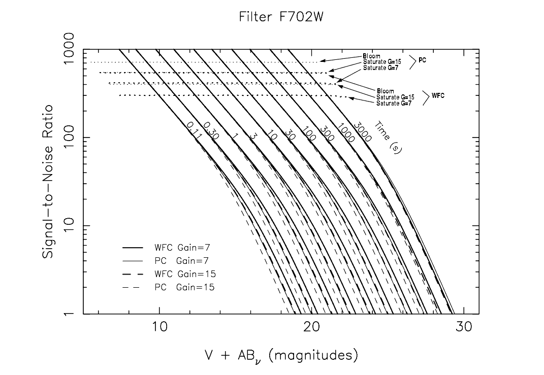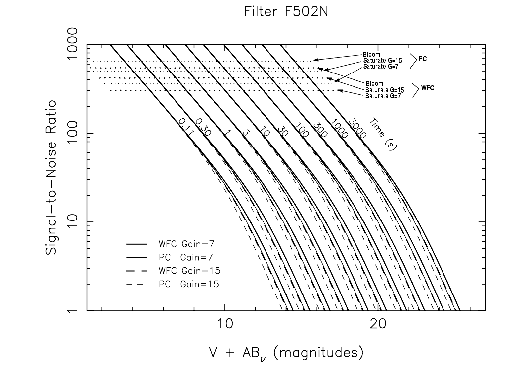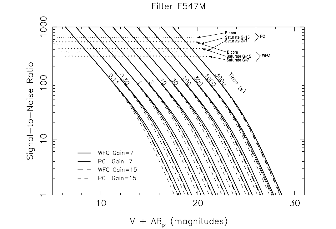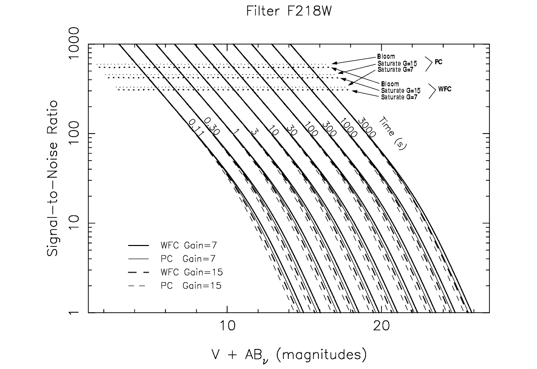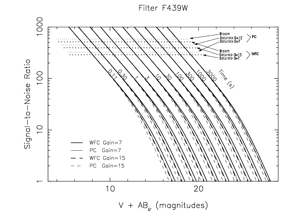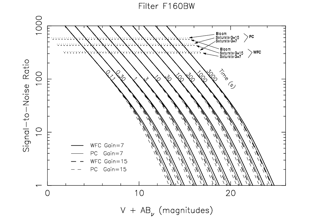 In this section we present plots which may be used to rapidly estimate signal-to-noise ratio (SNR) for point sources with stellar spectra observed through popular WFPC2 filters. Plots are given for filters F160BW, F218W, F255W, F300W, F336W, F410M, F439W, F502N, F547M, F555W, F606W, F675W, F702W, and F814W. These plots assume that the data will be analyzed by PSF fitting, which optimizes the SNR in the background noise limited case. They also assume an average sky background of V=22.9 mag arcsec-2. These plots do not explicitly include SNR reduction due to CR-SPLITing when the read noise dominates, but this effect is easily included as described below.