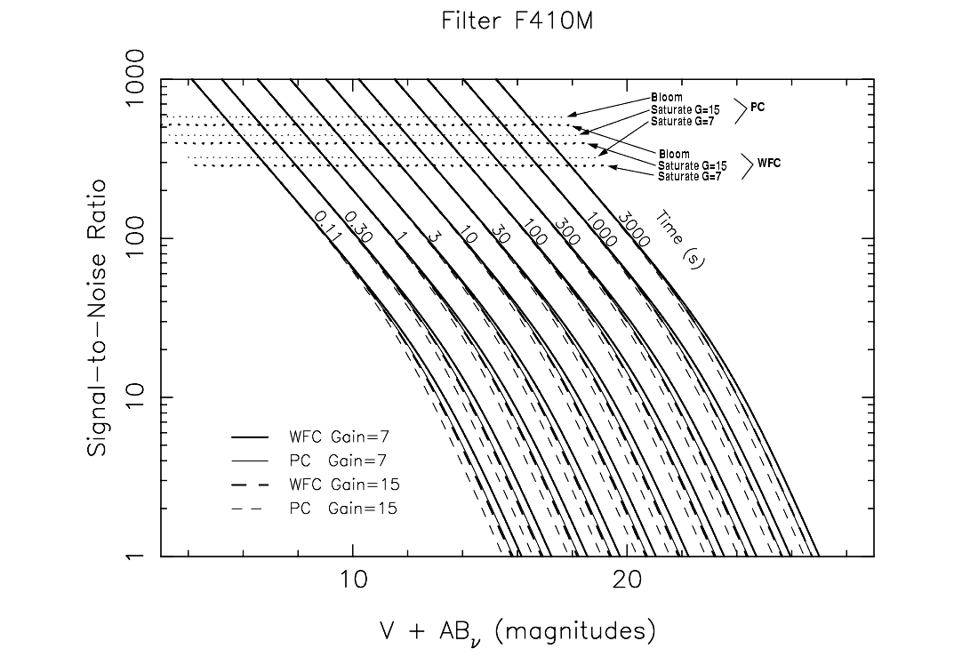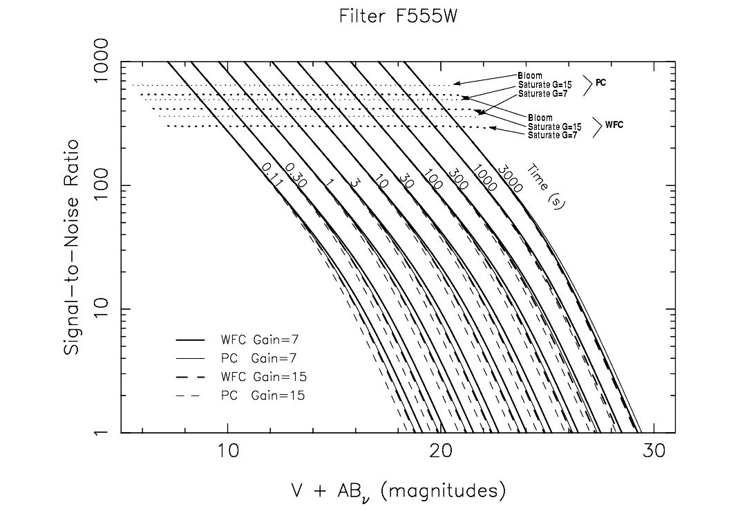 In situations requiring more detailed calculations (non-stellar spectra, extended sources, other sky background levels, don't know target V magnitude, etc.), the WFPC2 Exposure Time Calculator tool, located on the WFPC2 WWW pages, should be used instead.