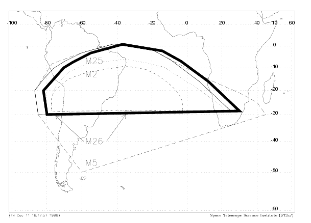 First, the South Atlantic Anomaly (SAA) contours used to limit WFPC2 observations were modified slightly. The SAA is a region where irregularities in the Earth's magnetic field cause very high cosmic ray rates. WFPC2 imaging is generally not scheduled near the SAA, so as to avoid excessive cosmic ray hits which degrade images by obliterating data in numerous pixels. These adverse effects are usually minimized by operating each instrument only when HST is outside a designated "SAA avoidance contour." (WFPC2 observations of time-critical phenomena can be taken inside the SAA avoidance contour, if necessary.) Biretta and Baggett (1998) analyzed available WFPC2 data, together with data from Air Force satellites flying in similar orbits, and redefined the WFPC2 SAA avoidance contour. This resulted in a 3% increase in designated SAA-free orbits, which allows better scheduling efficiency, and negatively impacts less than 0.1% of WFPC2 science observations. The current (post-1999) contour is given by the M26 area in Figure 4.11.