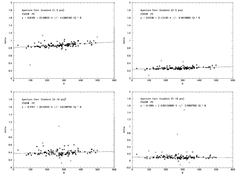 Gonzaga et al. (1999) have measured aperture corrections and characterized their change as a function of field position and filter. The differences in photometric magnitude between apertures with various radii (i.e. aperture corrections), and their mean and standard deviations for the F555W filter, are presented in Table 5.5. For example, the first row of the table indicates that stars measured with a 1 pixel radius aperture will be about 0.887 magnitude fainter than if a 5 pixel radius aperture were used (averaged over entire PC CCD), and this difference will vary by about 0.054 magnitudes RMS across the CCD.
