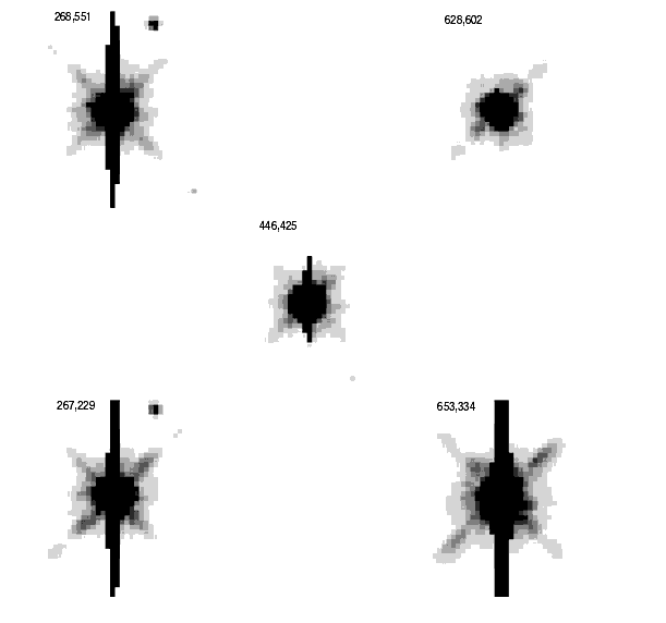 Figure 5.6: PSF Variations with Field Position - Obscuration Shifts. Five saturated PSFs observed in F814W are shown from a widely spaced grid on WF4. Note the changes in the spider diffraction spikes. CCD pixel positions are labeled. The vertical feature is caused by saturation and blooming (see Blooming).