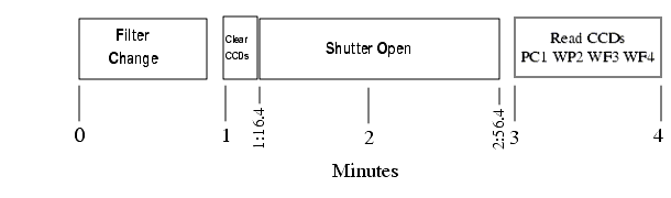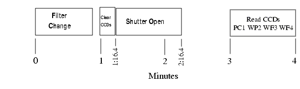 Figure 7.7: Event Timings During a 100s WFPC2 Exposure. This exposure, including the filter change, requires 4 minutes.